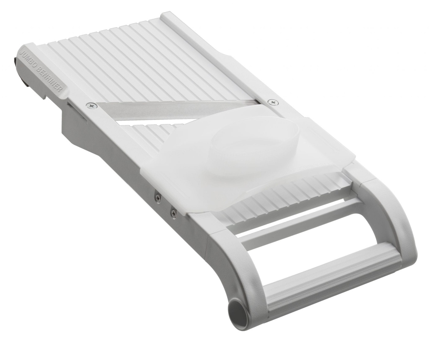En førsteklasses mandolin, der skærer grøntsager og rodfrugter i tynde skiver. Bladet er håndslebet og har en trinløs indstilling fra 0,5 til 10 mm. Den solide størrelse gør mandolinen særligt velegnet til store grøntsager. Der er en slipskærm på undersiden for at lette brugen.