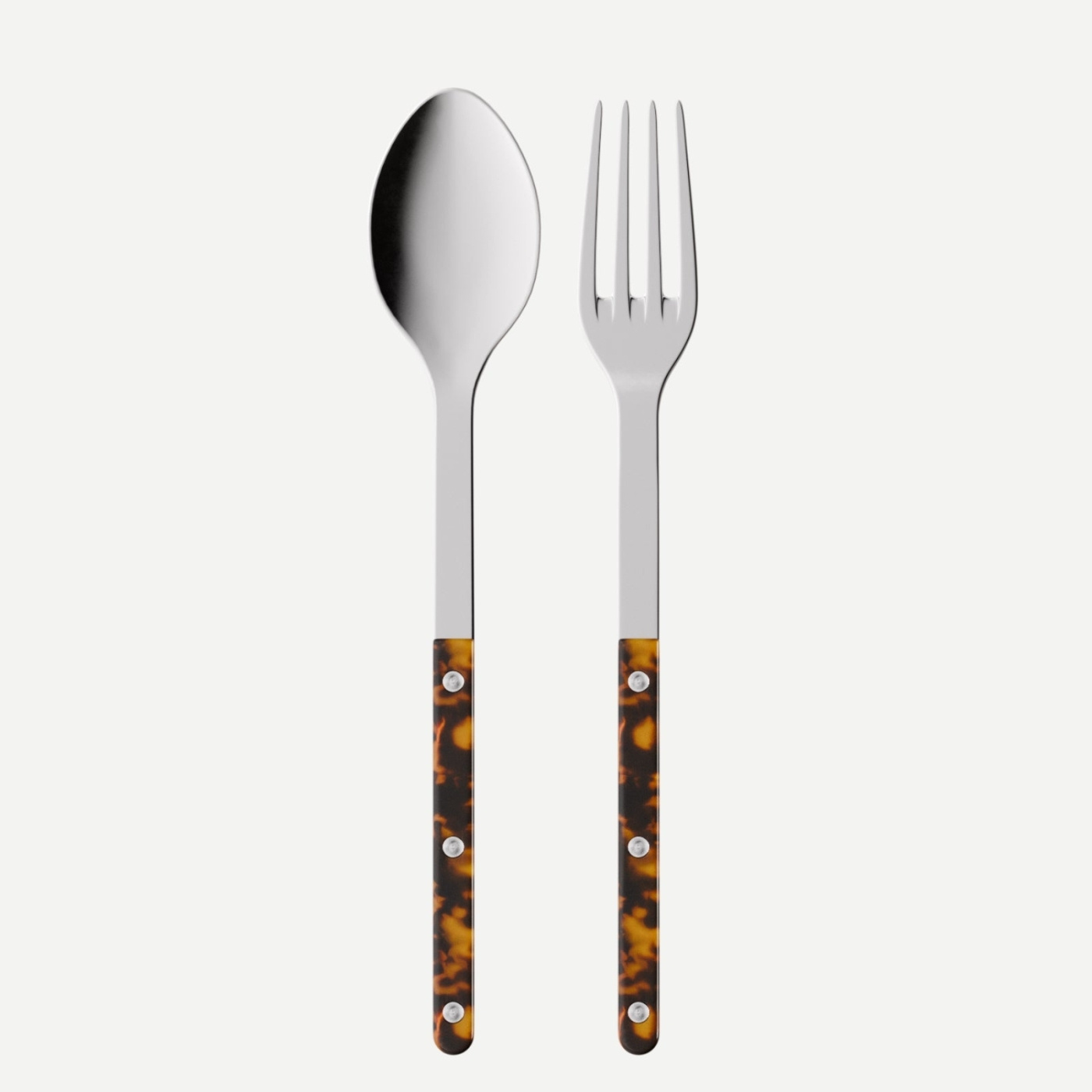 Robust serveringsbestik i Bistrot-serien med generøs længde, rustfrit stål og holdbare nylonhåndtag. De ligger godt i hånden og er designet til at opfylde kravene i både hjemmet og det professionelle køkkenmiljø. Gaflen giver et godt greb uden at skære eller knuse, og skeen har en god dybde uden at føles klodset. Kombinationen gør dem til et stabilt serveringspar, der kan klare det meste på bordet - uanset om det er rustikt, elegant eller midt imellem. Her i et stilfuldt skildpaddemønster, der matcher din intellektuelle bedstefars briller.