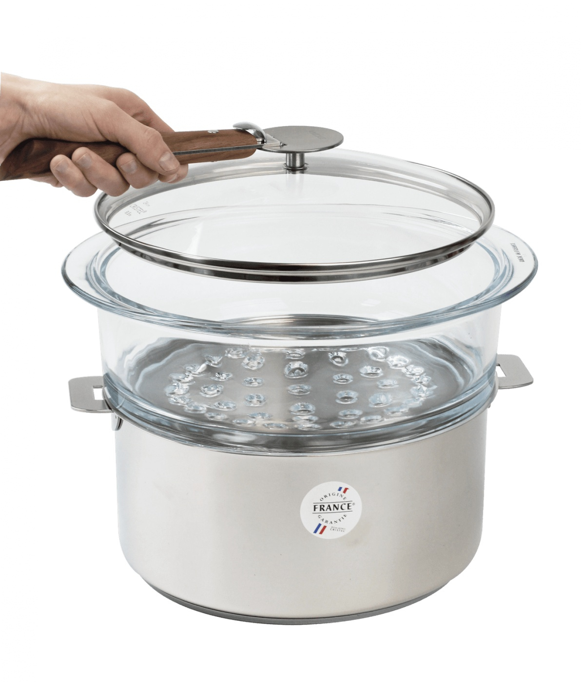 Glasdampindsats med glaslåg. Fås i to størrelser, 20 cm eller 24 cm, og passer til alle Cristel-kasseroller med samme diameter. Låget er lavet af glas med en rustfri stålkant og en rustfri stålknap. Du kan også sætte et aftageligt håndtag på knoppen, hvis det bliver for varmt. Tåler opvaskemaskine.