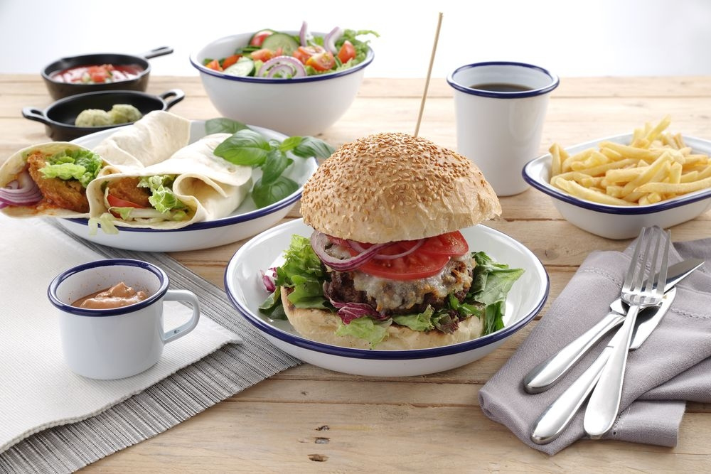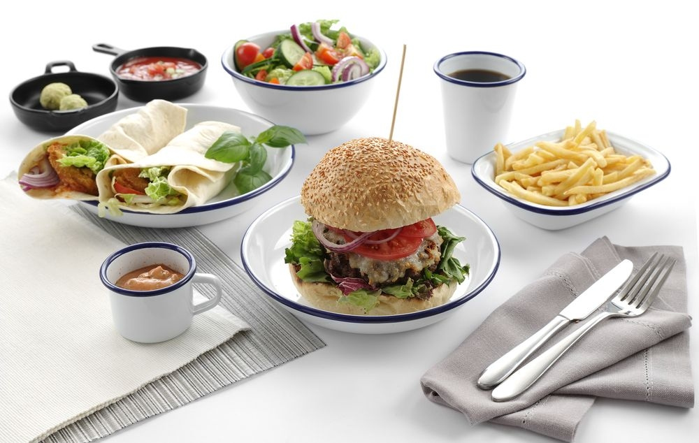 • Emaljeret porcelæn har en evne til at kommunikere, at dette ikke er et almindeligt restaurantkøkken, på en måde som få andre materialvalg formår. Det hvide med blå kant er en klassiker med rødder i feltkökkenet, kolonihavehuset, mormors syltetøjsglas og den enkle hjemmelavede mad. Det er en æstetik, der enten passer perfekt eller slet ikke, alt efter hvad man laver.