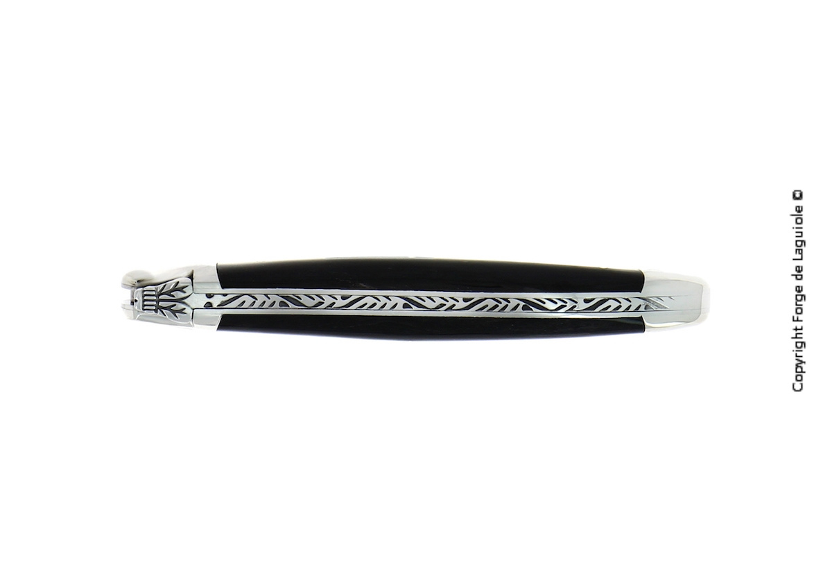 Forge de Laguiole's raison d'être er og har altid været foldekniven. Det var der, det hele startede, og det er der, alting kommer fra. Denne foldekniv på 12 cm er en god størrelse til at bruge som madkniv eller kødkniv ved en fin middag. Håndtaget er lavet af oksehorn (oprindelse Nigeria), og på disse er de mørke dele af de marmorerede horn blevet brugt.