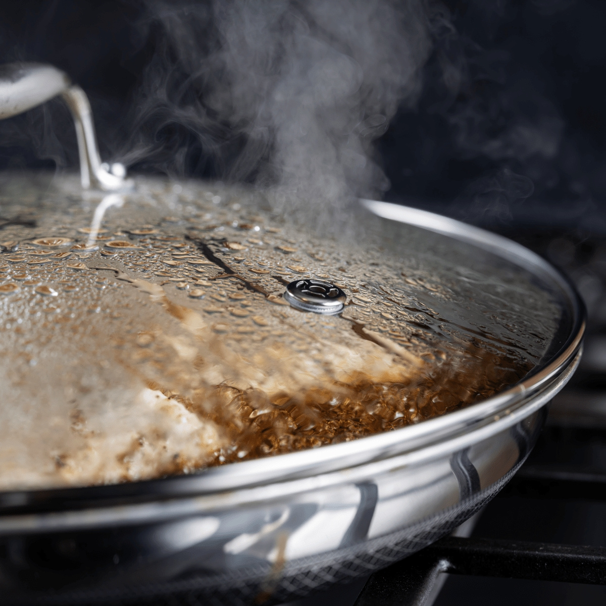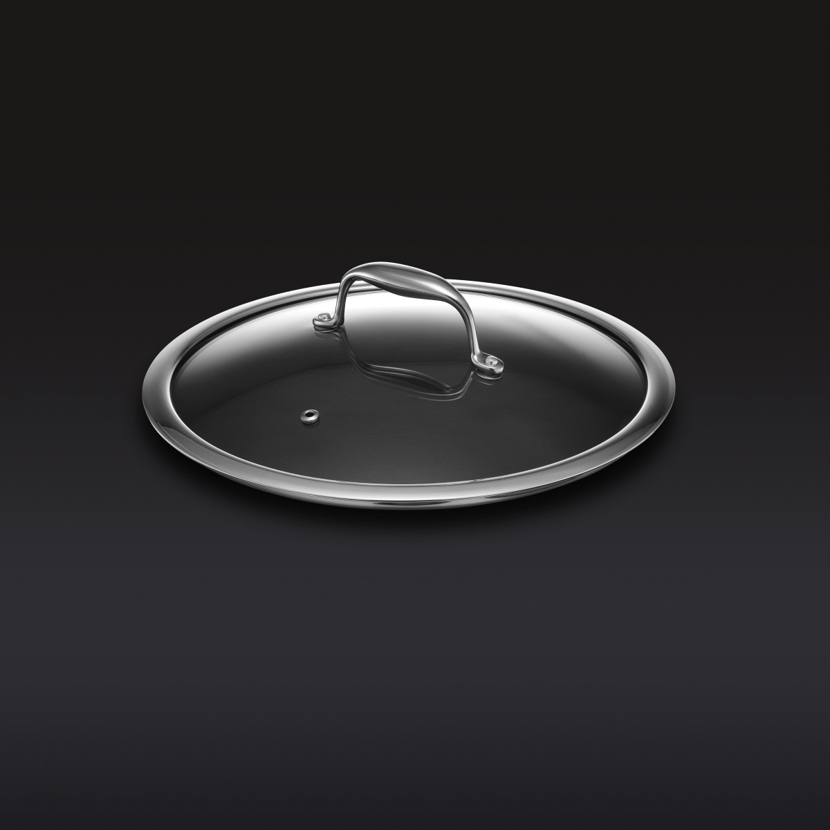 Låget er lavet af hærdet glas for stabilitet og holdbarhed, kombineret med en robust stålkant, der modstår slid og varme. Den gennemsigtige overflade gør det nemt at følge tilberedningsprocessen uden at miste varme eller damp, hvilket er særligt værdifuldt til saucer, gryderetter, eller når du vil bevare saftighed og smag.