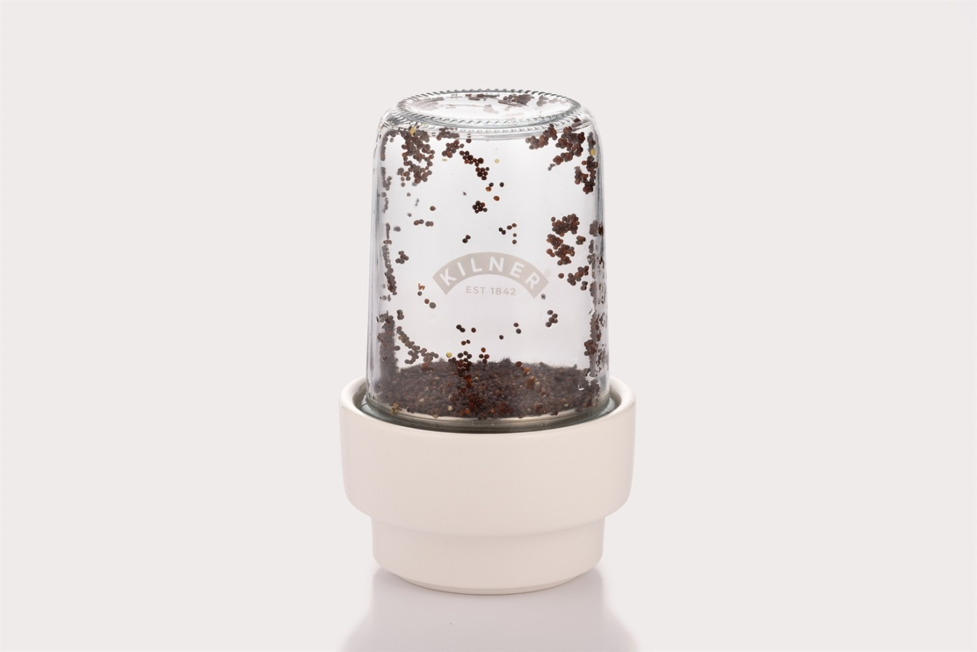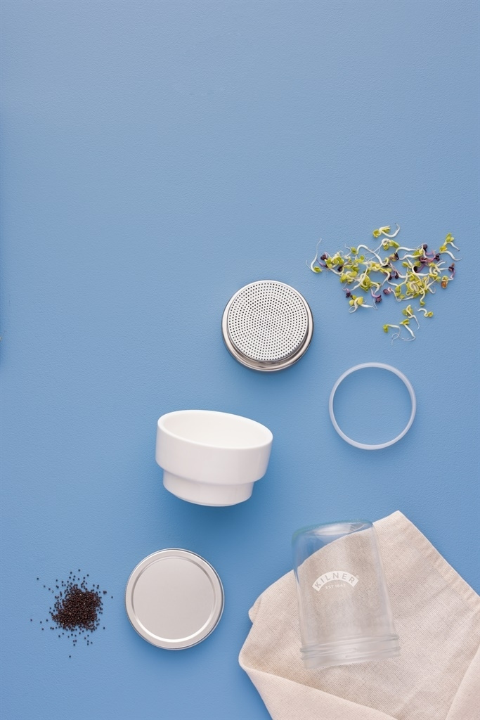 En kuppel, der hjælper dig med at dyrke dine egne spirer og mikrogrønt til de fine tallerkener. Består af en keramisk base, silikone- og metalnetindsats og selve glaskrukken. Et enkelt, men attraktivt design til udstilling i køkkenet. Ø 11,5 cm, højde 21 cm. Volumen 500 ml.