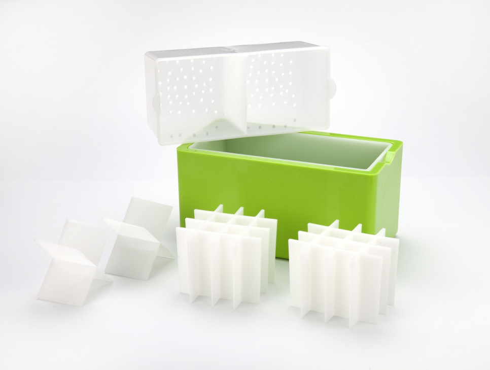 Form til at lave krystalklare isterninger hjemme i fryseren. Kassen har en form, der gør det muligt for vandet at fryse på samme måde som overfladen af søer. Kassen er isoleret i bunden og på siderne, så alle iskrystaller dannes i én retning. Vand har sin største massefylde ved 4ºC, hvilket betyder, at når det fryser, siver det.
