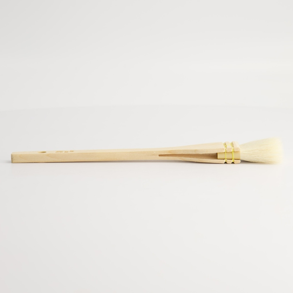 En klassisk japansk madlavningspensel, uchiwa bashi, lavet af håndbundne gedebørster og et ubehandlet træhåndtag. Den bruges traditionelt til at pensle tare (sauce) på grillede spyd som yakitori eller kushiyaki, men fungerer lige så godt til glasering, oliering af støbejern eller bagning.