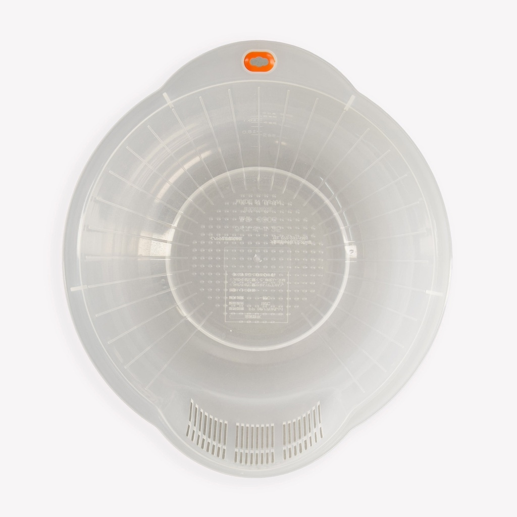 Denne japanske model i gennemsigtig plast har en indbygget si med finmaskede drænriller, der gør, at vandet løber hurtigt ud uden risiko for at miste et eneste korn. Formen gør det nemt at cirkulere risene i vandet - den bevægelse, der frigør stivelsen og giver det rene, sprøde resultat, når de er kogt.