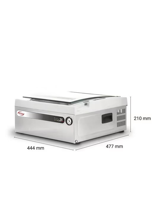 Orved EVOX 25 er en kompakt kammervakuummaskine som kan gemme sig i en almindelig køkkenskuffe men leverer professionel vakuumkraft. Den er perfekt til dig der vil have effektiv vakuumpakning derhjemme uden at fylde hele køkkenbordet. Det smarte design betyder at maskinen passer i standardskuffer i almindelige køkkensystemer og alligevel har kraft nok til kød, væsker, glas og flade pakker.