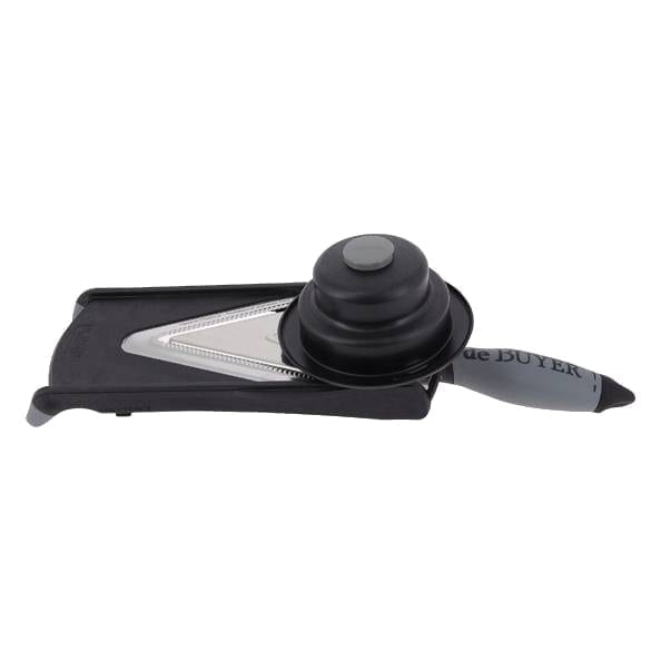 nEn professionel mandolin fra de Buyer med en klinge fra det franske knivmærke Thiers. Med et justerbart blad, der gør det muligt at snitte så tyndt som 0,2 mm og så groft som 5 mm. Bladet er V-formet og har bittesmå savtænder for at gøre det så effektivt som muligt selv på de tyndeste indstillinger. Den leveres også med knappen på billedet, som giver dig mulighed for at skære hele råmaterialet ned, selv der, hvor dine fingre normalt begynder at tage skade. Den er også lavet af et skridsikkert materiale. nDimensioner