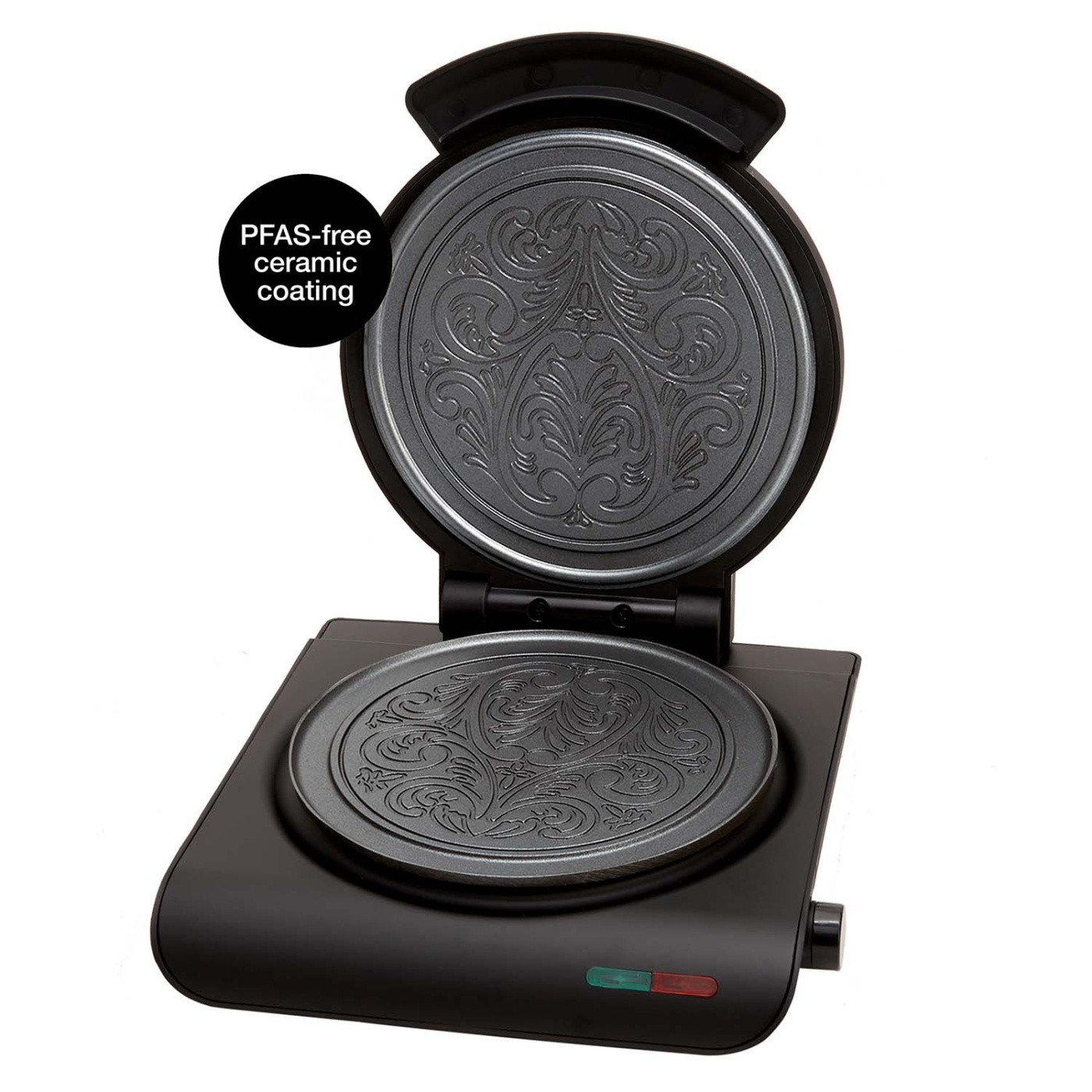 Med et håndtag designet til at forhindre forbrændinger.