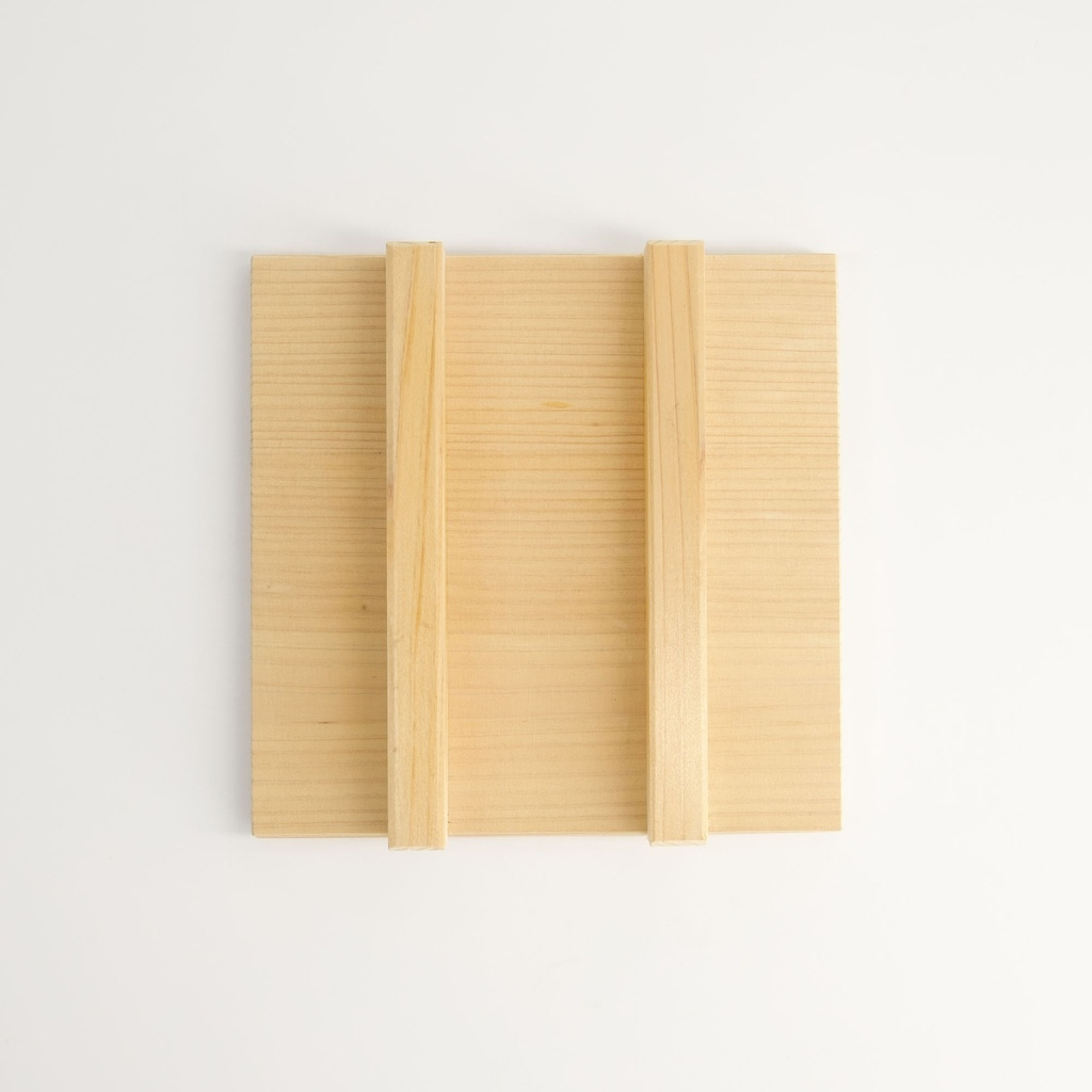 Lågets design er enkelt, men gennemtænkt: en flad træskive med to tværgående håndtag, der gør det nemt at gribe og placere med én hånd. Træ leder ikke varme som metal, så man kan arbejde hurtigt uden at brænde sig, og overfladen absorberer noget af fugten fra ægget, hvilket bidrager til den tørre, elastiske overflade, der kendetegner en god tamagoyaki.