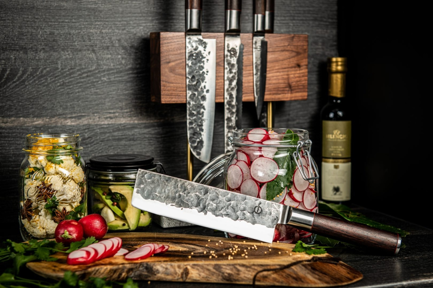 En stilfuld knivblok, som giver dine knive en elegant og fremtrædende placering på køkkenbordet. Den er fantastisk til både at vise stilfulde knive frem, og magnetlisten er også den absolut bedste måde at opbevare knive på derhjemme. Denne model betyder, at du ikke behøver at skrue fliserne fast, men stadig kan opbevare knivene med stil. Blokken har magneter til at fastgøre knive på begge sider. Fremstillet af valnøddetræ med en base af natursten. Der medfølger pinde i både sort og sølv, så du kan vælge finish. Så den kan matche din personlighed, uanset om du er goth eller har repræsenteret Bengan Boys ved OL.