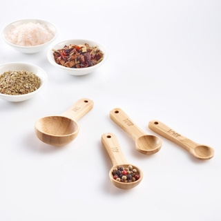 - praktisk sæt af bambus - til tørre krydderier - med indgraverede størrelser (1x 1 TBSP, 1 TSP, 1/2 TSP, 1/4 TSP hver) - inkl. læderstrop til at holde skeerne sammen i skuffen|