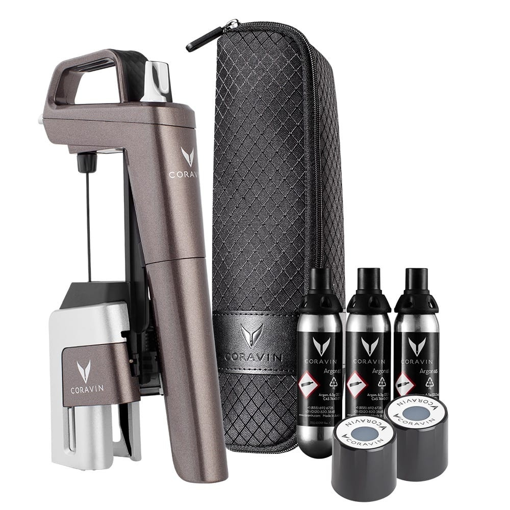 - Paket med Coravin, standardnål, carry case, tre patroner gas och två skruvkorkar
