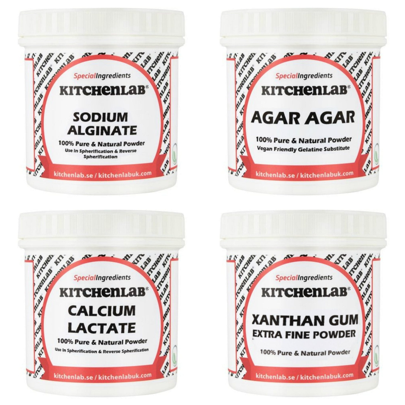 Dette sæt indeholder fire ingredienser, så du kan komme i gang med molekylær gastronomi. Den uindviede vil blive forbløffet over, hvad man kan opnå med enkle opskrifter og disse fire stoffer.