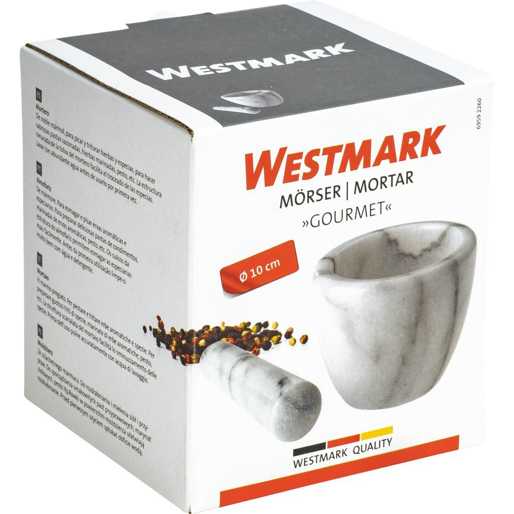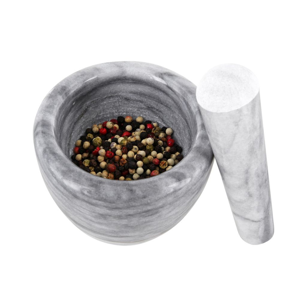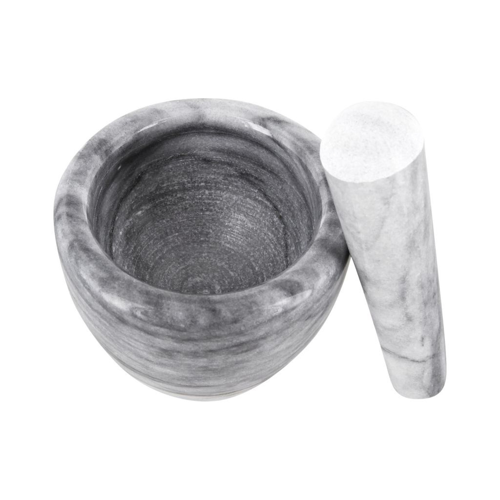 Denne elegante og robuste morter og støder i marmor gør det nemt for dig at tilberede krydrede pastaer og marinader til friske, sunde retter. De rillede overflader på indersiden af morteren og undersiden af støderen sikrer fuld aromaudvikling, når krydderier og krydderurter knuses og males. Nyd smagen!