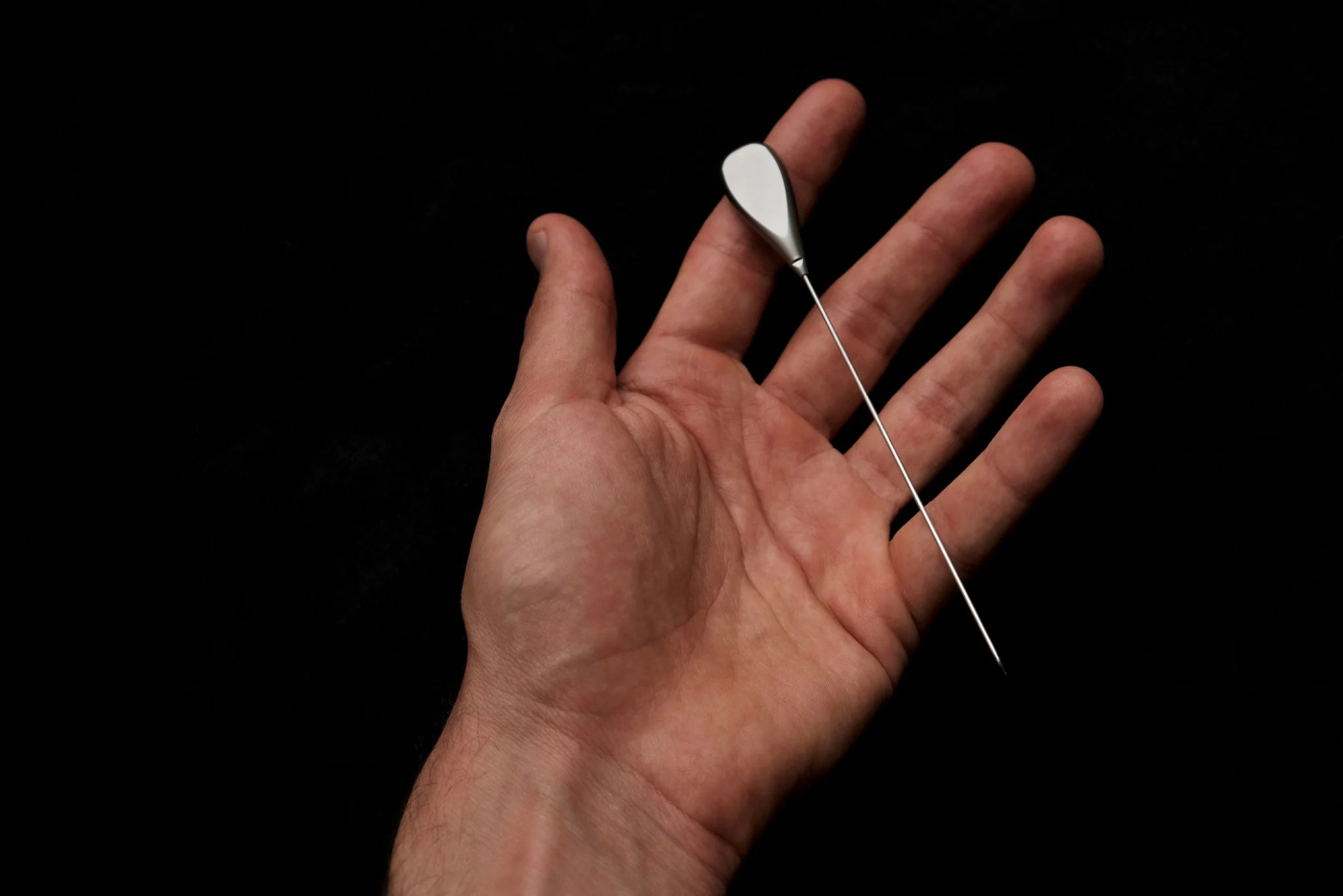 En kagestikker, der ikke smelter, knækker eller går fra hinanden. Noyau er fremstillet af stærkt japansk stål – et mere passende materiale end den polyurethan, der ofte bruges af producenter. Inspireret af cocktailpinde fundet i barer og antikbutikker i Kyoto, er Noyaus hoved fladpresset for at føles som et vægtet plekter og klemt ved basen for at holde stangen sikkert på plads. Spidsen er spidset som en tandstik, så den let glider gennem kød, fisk, kage og grøntsager uden at beskadige struktur, fibre eller krumme.