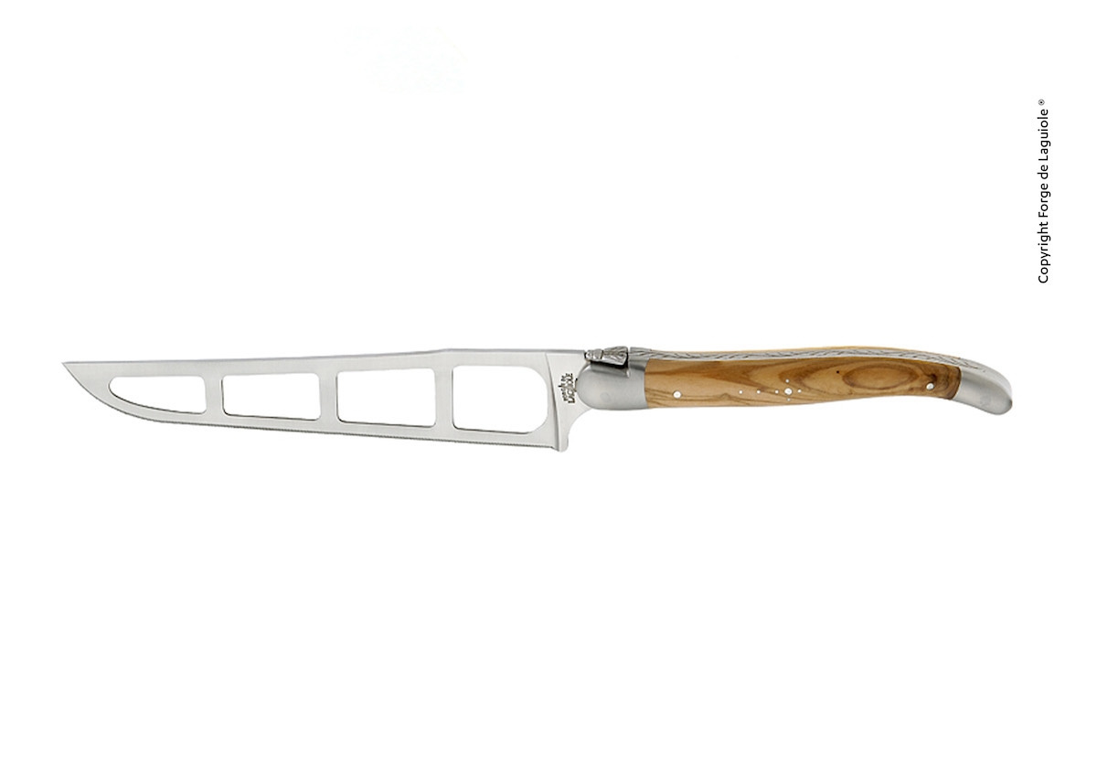 Her er en klassisk ostekniv med lufthuller, som forhindrer, at den klæber og smitter af på bløde oste og kitoste. Håndtaget er lavet af oliventræ med et lyst og uforligneligt udseende.