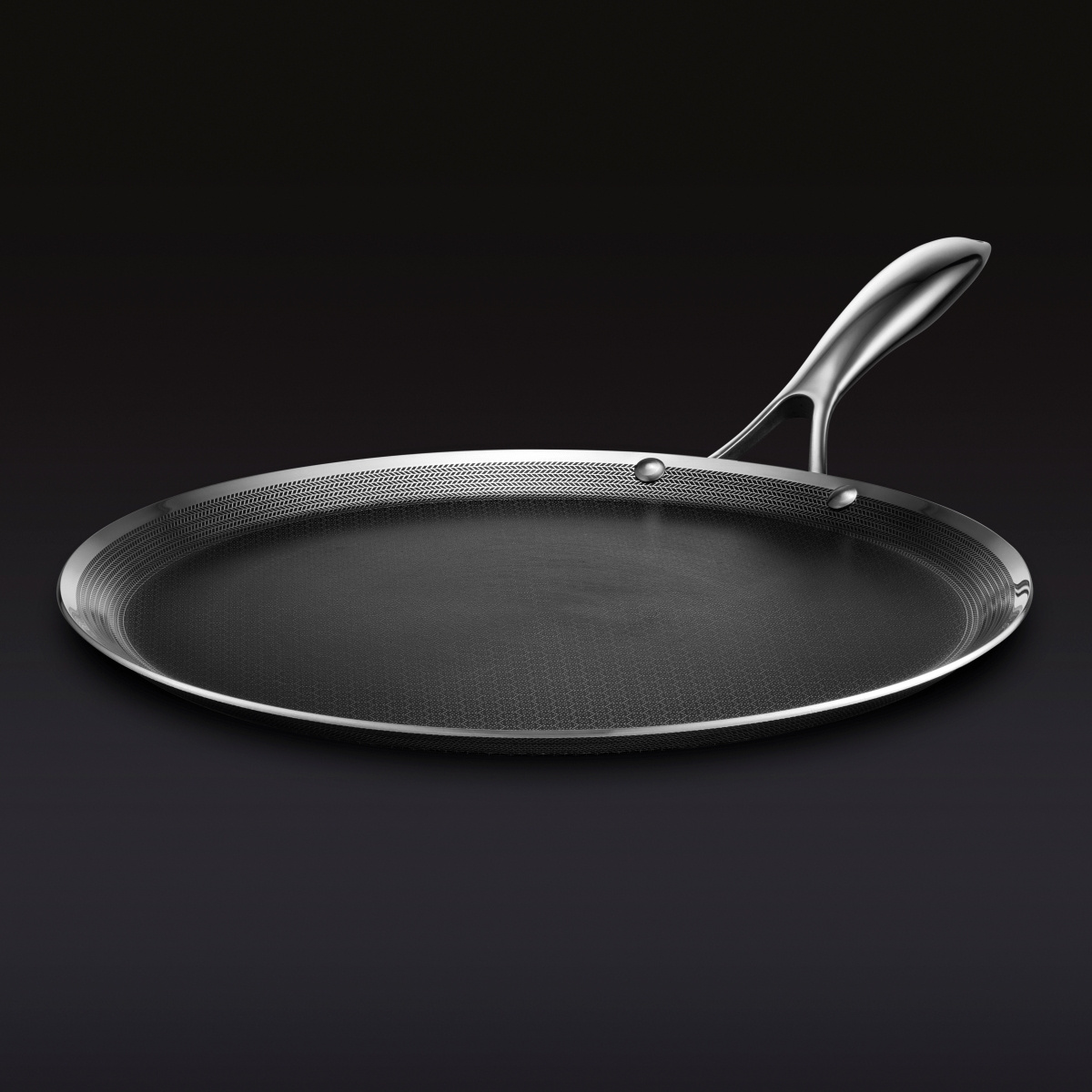 Hexclad Hybrid Griddle på 30 cm er grundlaget for sprøde morgenmadsklassikere, grillede grøntsager eller perfekt brunede bøffer - alt sammen på en flad, hybridbelagt stegeflade. Dens lave profil gør den ideel til pandekager, tortillas, sliders, bacon eller æg, men den har også kapacitet til et solidt stykke kød eller fisk og skaldyr på grillen.