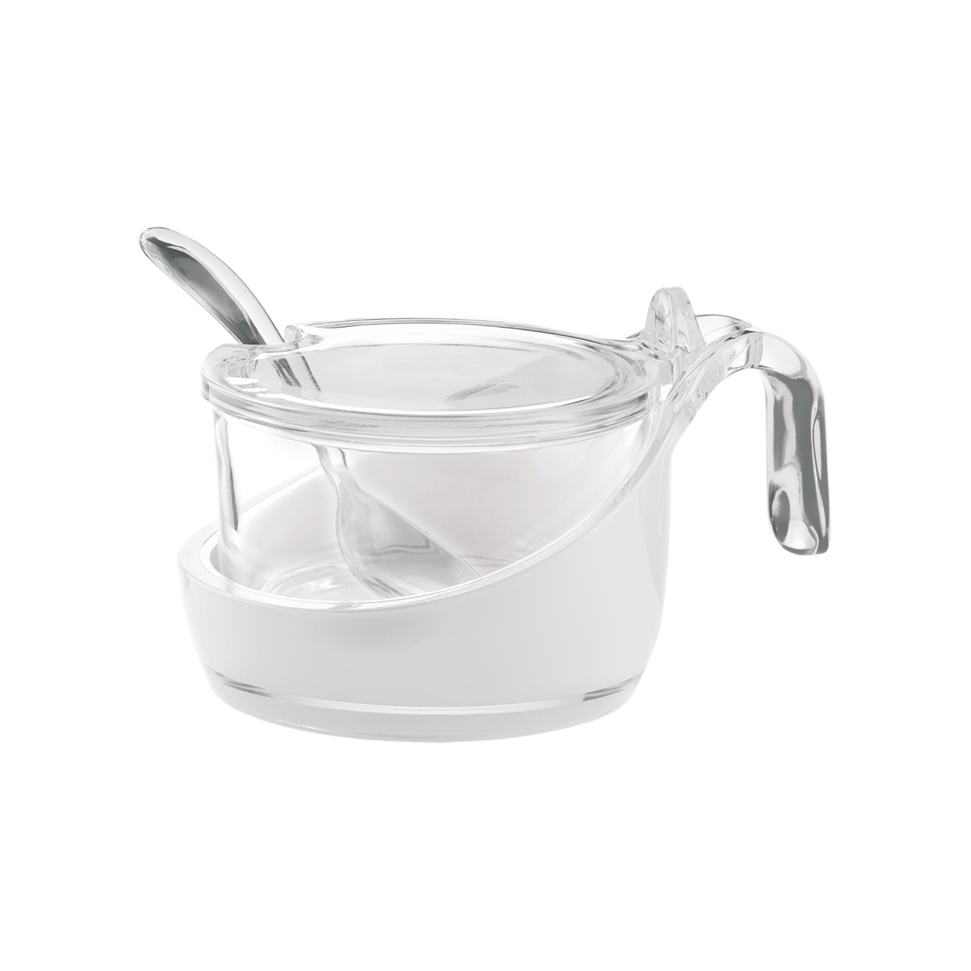 Skålen har en inderbeholder i glas og et låg der nemt kan åbnes med én hånd når det er tid til en ekstra portion. Den medfølgende ske ligger altid klar i låget, hvilket gør serveringen nem både ved middagsbordet og til morgenmad eller kaffe.
