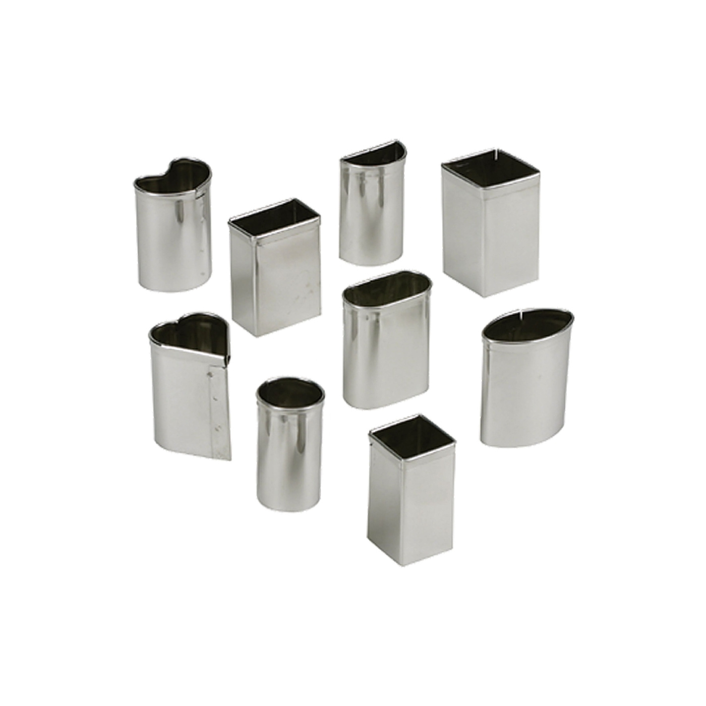 Sættet indeholder ni udstikkere i rustfrit stål i ni klassiske petit fours-former: bue, kurve, diamant, hjerte, oval, rund oval, rund, rektangel og kvadrat. Formvariationen dækker det traditionelle petit fours-sortiment og muliggør konsekvent formgivning uden at skifte værktøjssæt.