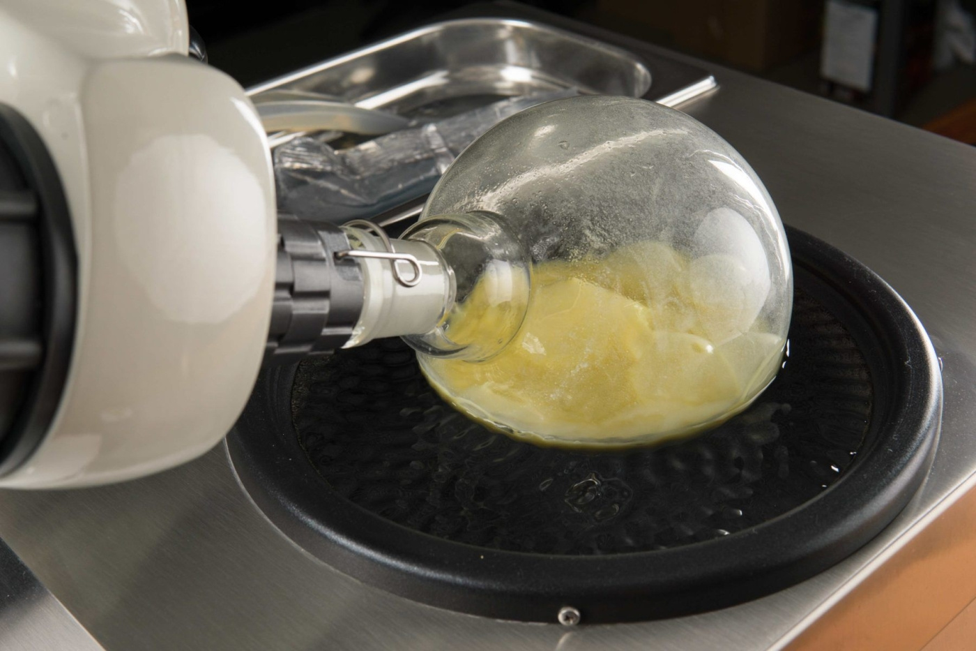 Enheden har en maksimal rotationshastighed på op til 200 omdrejninger i minuttet og et bad med temperaturkontrol fra omgivelsestemperatur op til 99 °C, hvilket gør den velegnet til en række forskellige anvendelser, blandt andet reduktioner og tilberedning med reflux. Højden kan justeres med elektrisk motor og vakuumniveauet kan sænkes ned til -0,8 bar, hvilket giver kontrol over processen og effektivt fjerner vand under vakuum samtidig med at aromaerne bevares. Maskinen leveres komplet med fordampningskolbe, kondensator og opsamlingskolbe samt vakuumpumpe, temperaturføler og elektronisk styring af rotationshastigheden med display, som gør det nemmere at indstille og følge processerne.