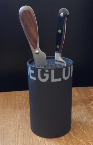 "Lille og praktisk knivholder fra franske Déglon. Selvom stativet er lille, kan det rumme mange knive, takket være det faktum, at det i stedet for at have faste rum, som mange andre knivstativer har, har et indre af plastikstrå, der gør det muligt at placere knivene i knivstativet, lige som du vil have dem.