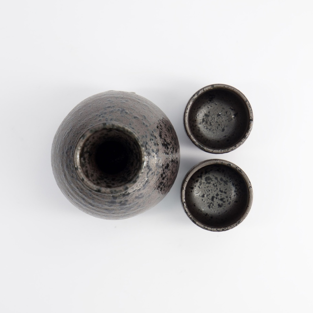 Et komplet sake-sæt bestående af en tokkuri (karaffel) og to choko (kopper). Sættet er lavet af stentøj med en mørk, levende glasur, der veksler mellem grå, sorte og brune toner - et udtryk for japansk wabi-sabi, hvor hver variation ses som et tegn på håndværkets autenticitet.