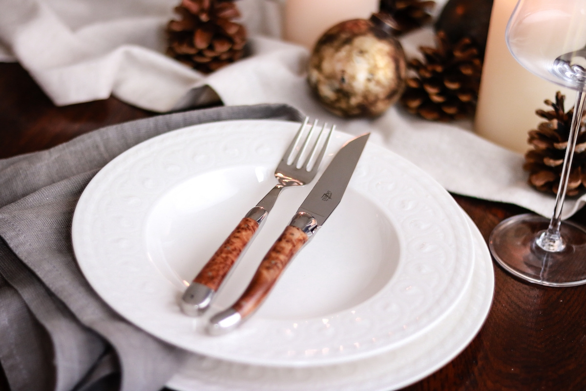 Her er der ikke sparet en millimeter på kvaliteten, men hvert stykke bestik, der forlader den lille fabrik, er finjusteret ned til mindste detalje. Bladene, der er lavet af fransk T14 rustfrit stål, smedes på stedet i fabrikken i 1000 grader varme ovne. Håndtagene af træ eller dyr skæres og poleres i hånden af erfarne knivmagere, og knivens pasform er himmelsk. Alt er perfekt! Dette er bestik, som vil være kronen på værket i dit hjem eller din restaurant og en fornøjelse at bruge hver gang!