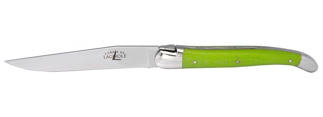 Bladene er 11 cm lange, hele kniven 23,5 cm, og er lavet af T12 rustfrit stål, der er specielt designet og udviklet af Laguiole. Stålet er meget holdbart og holder sin skarphed i lang tid.