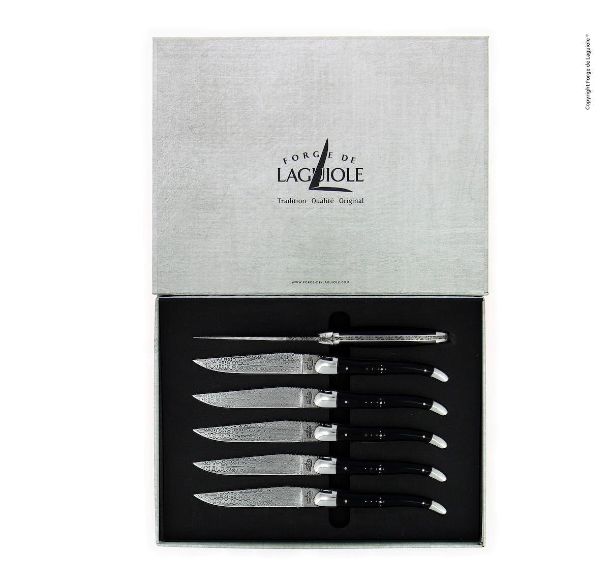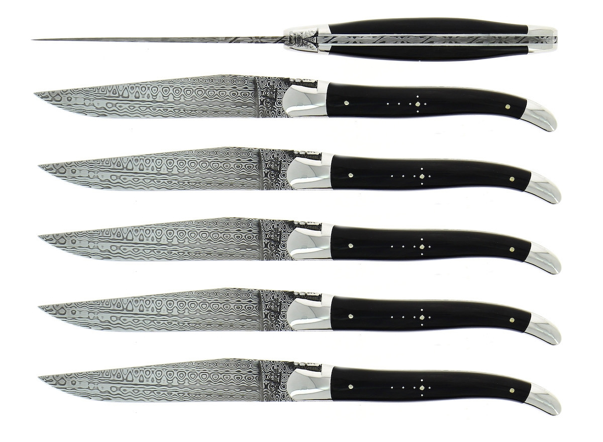 Seks knive, skaft af mørkt horn, damasceneret, Collection - Forge de Laguiole