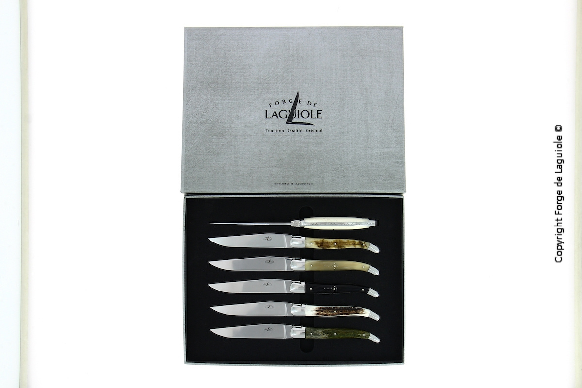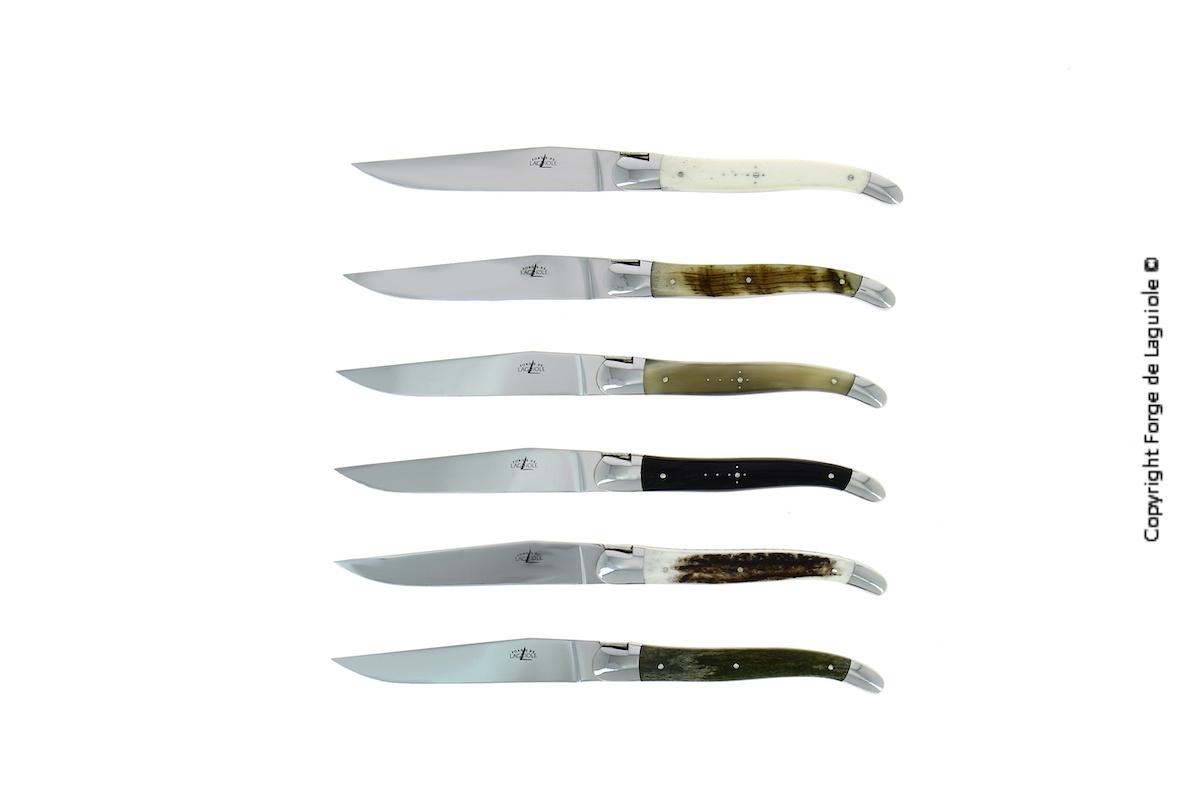 Seks knive, skafter af forskellige animalske materialer, polerede, Tradition - Forge de Laguiole