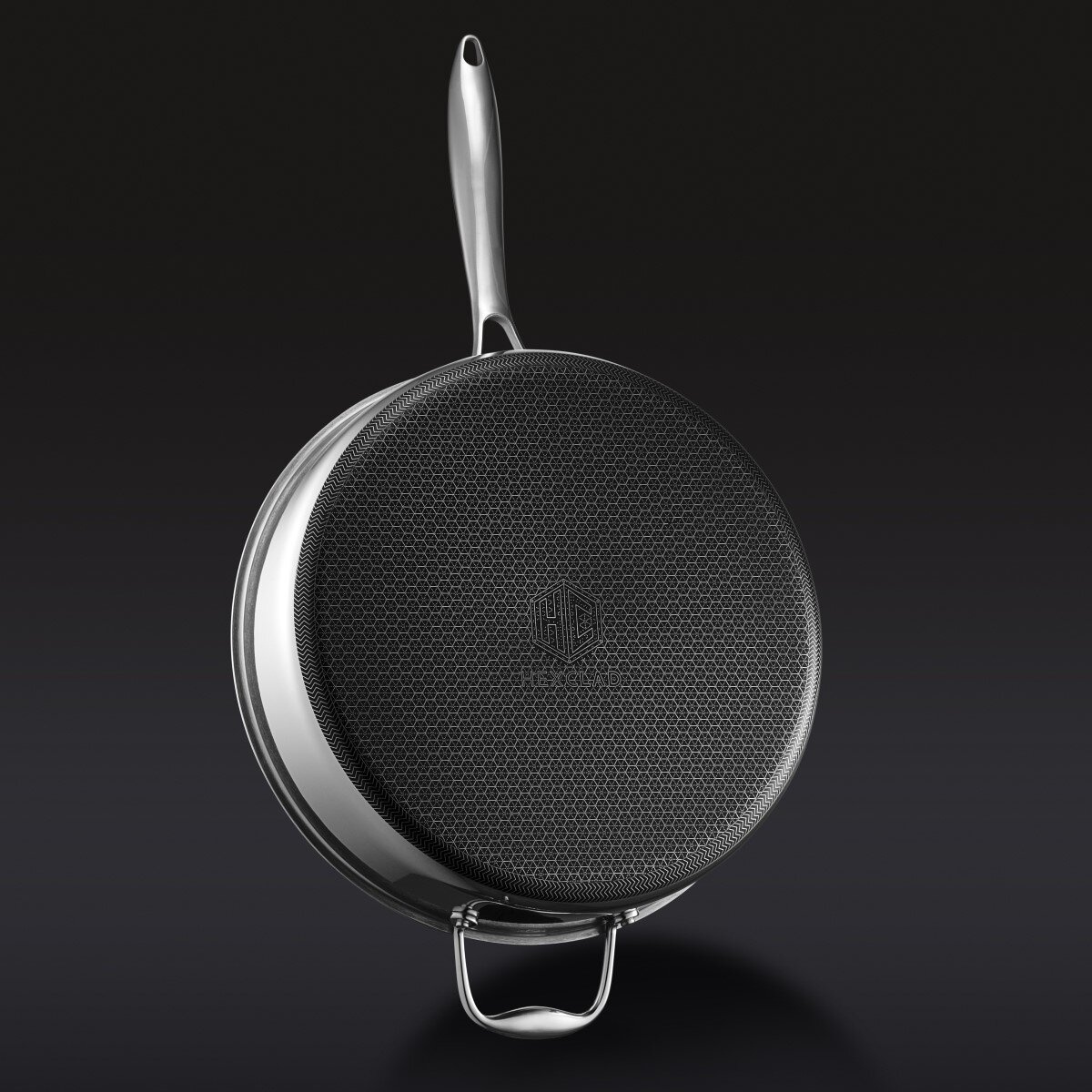 Hexclad Hybrid sauterpande 30 cm / 5 L er panden til dem, der vil have en alsidig partner i køkkenet - fra bruning og stegning til simring, braisering og større retter. Den rummelige volumen gør det nemt at håndtere grøntsager, kød, saucer eller sofistikerede retter med flere portioner uden at blive trængt.