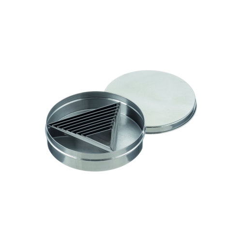 Sættet indeholder ni trekantformede udstikkere med slette ægge, fremstillet i 0,4 mm rustfrit stål, med sidelængder fra 42 til 124 mm i ni trin. Højden på 30 mm giver formerne stabilitet under presset fra udskæringen. Opbevaringsboks medfølger.