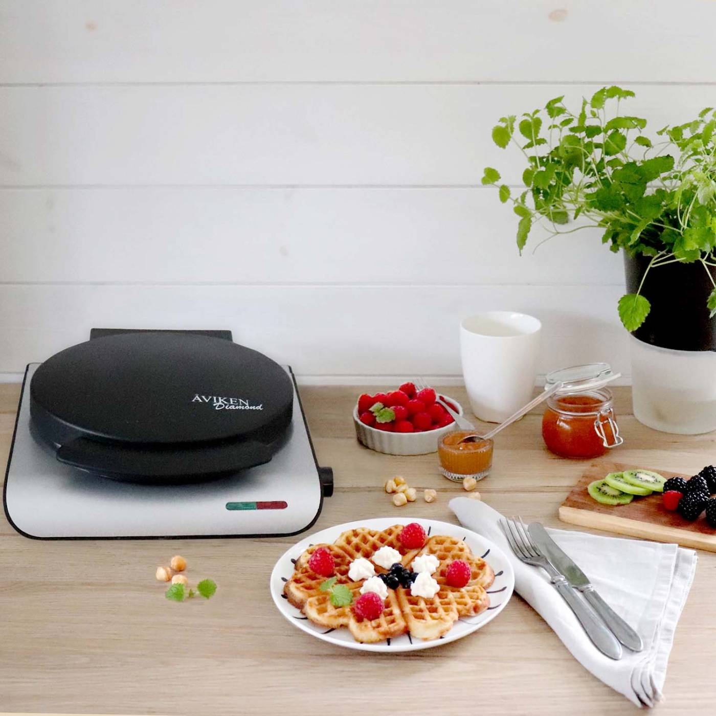 Dette vaffeljern kombinerer funktion, ydeevne og stilrent design, hvilket gør det til et fremragende valg til både hverdagsmorgenmad og hyggelige weekender, hvor du vil have store, sprøde vafler på bordet.