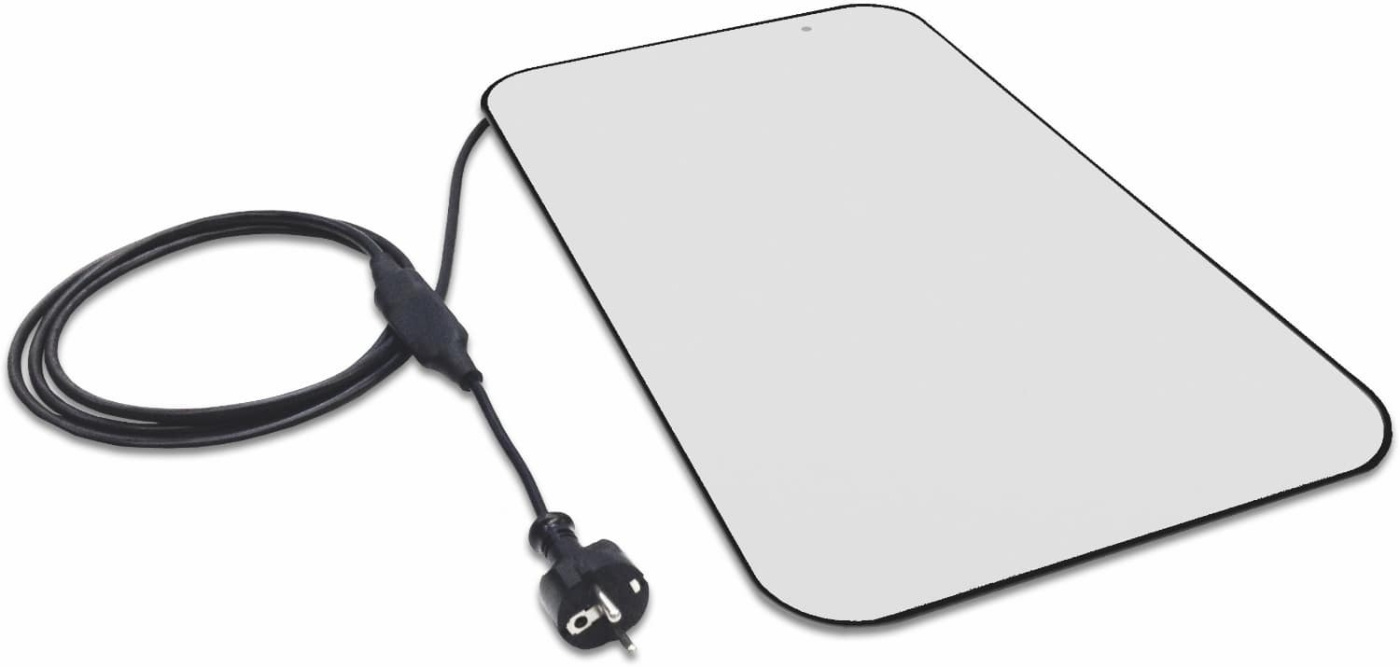 Temperaturbestandig op til 120°C og stænkbeskyttet. Mål: 480×280×10 mm, vægt 1,2 kg. Tilslutning 230 V.
