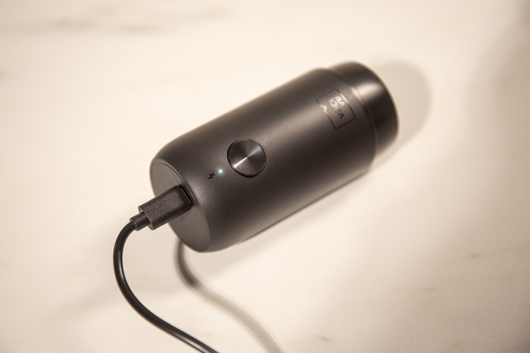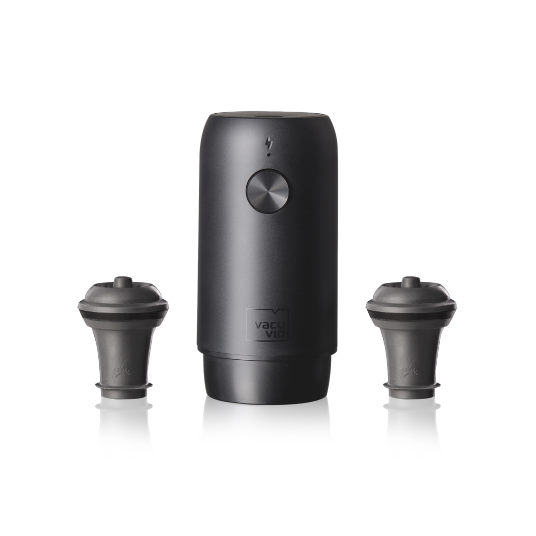 Pumpen kan håndtere op til 40 flasker uden genopladning. Leveres med to silikonepropper (samme standardstørrelse som på alle Wine Saver) og USB-kabel til opladning af batteriet.