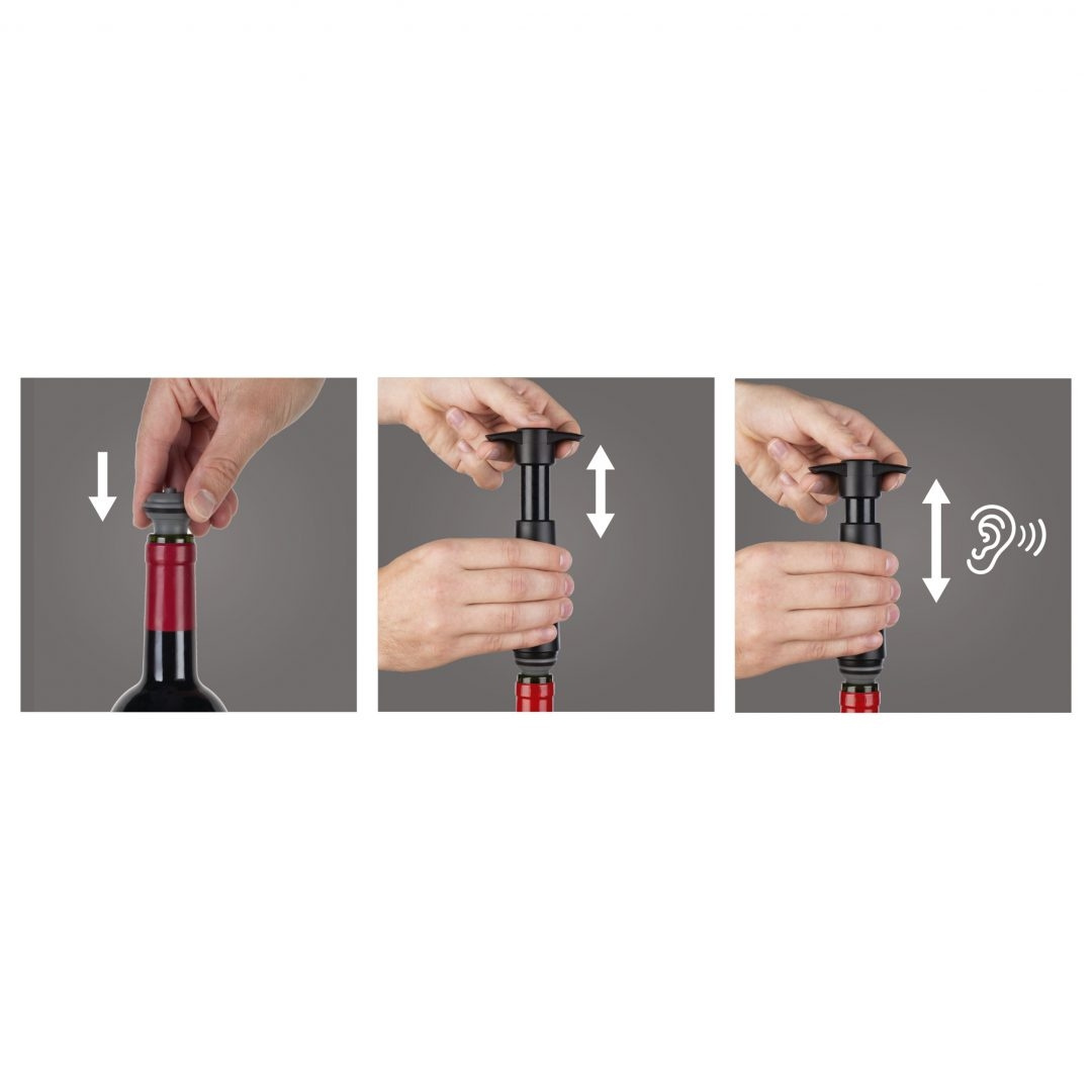 Vakuumpumpe til at få luften ud af vinflasker og genforsegle dem med en korkprop. En god måde at give vinen et par dages ekstra liv på. Den klikker, når du får nok vakuum.